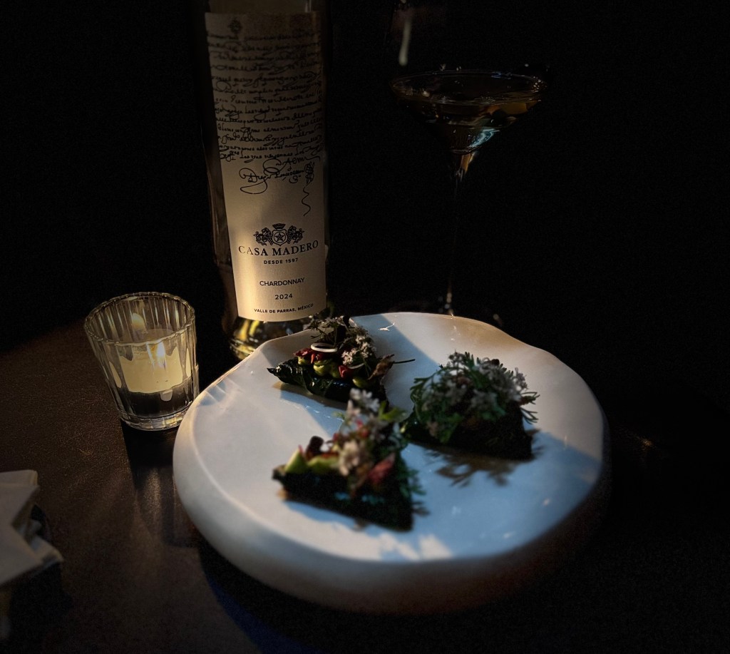 Después, el recorrido condujo a Bar de Xuna, donde la atmósfera cambiaba, como si el tiempo decidiera moverse más despacio. En ese espacio, la cocina —guiada por la visión de Jonatán Gómez Luna— se expresó con una profundidad que conecta pasado y presente. La tetela con mole y chicatanas no era solo un platillo: era memoria, territorio, identidad. A su lado, el Casa Madero Chardonnay 2024 revelaba su frescura luminosa, elevando cada matiz con una precisión casi intuitiva.