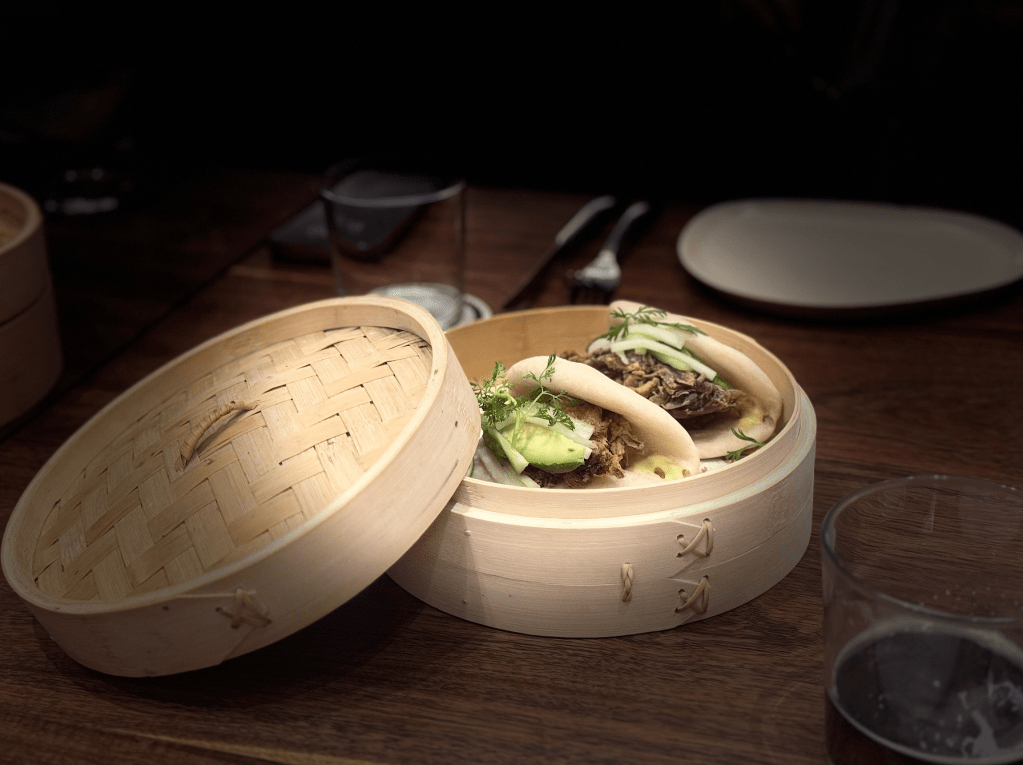 Lo que llega a la mesa confirma esa intención. El bao de jaiba de concha suave aparece como un primer gesto preciso: ligero, delicado, con una textura que contrasta sutilmente con la profundidad de la mayonesa de algas. Todo se siente en equilibrio, sin que ningún elemento intente dominar al otro. Luego, los ravioles con foie gras y trufa revelan otra dimensión de la cocina: más envolvente, más profunda, pero igual de contenida. Hay una riqueza evidente, pero medida, donde cada bocado se siente completo, sin necesidad de excesos.
