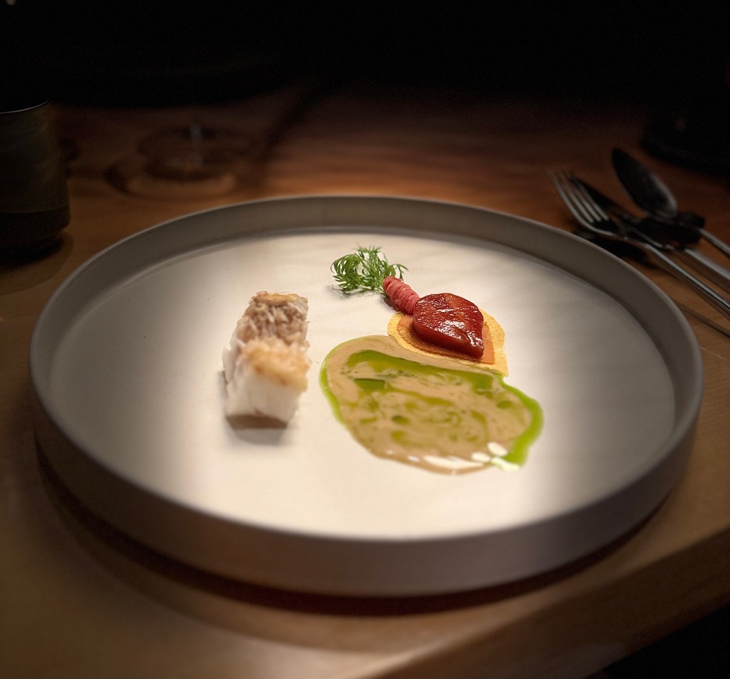 Cada plato llega como una pausa, una secuencia que se despliega con una lógica silenciosa, donde el producto dicta el ritmo. El pescado, tratado con un respeto absoluto, conserva una pureza que se siente intacta, como si aún guardara la memoria del agua. Las texturas son ligeras, precisas, pensadas para desaparecer en el momento exacto.