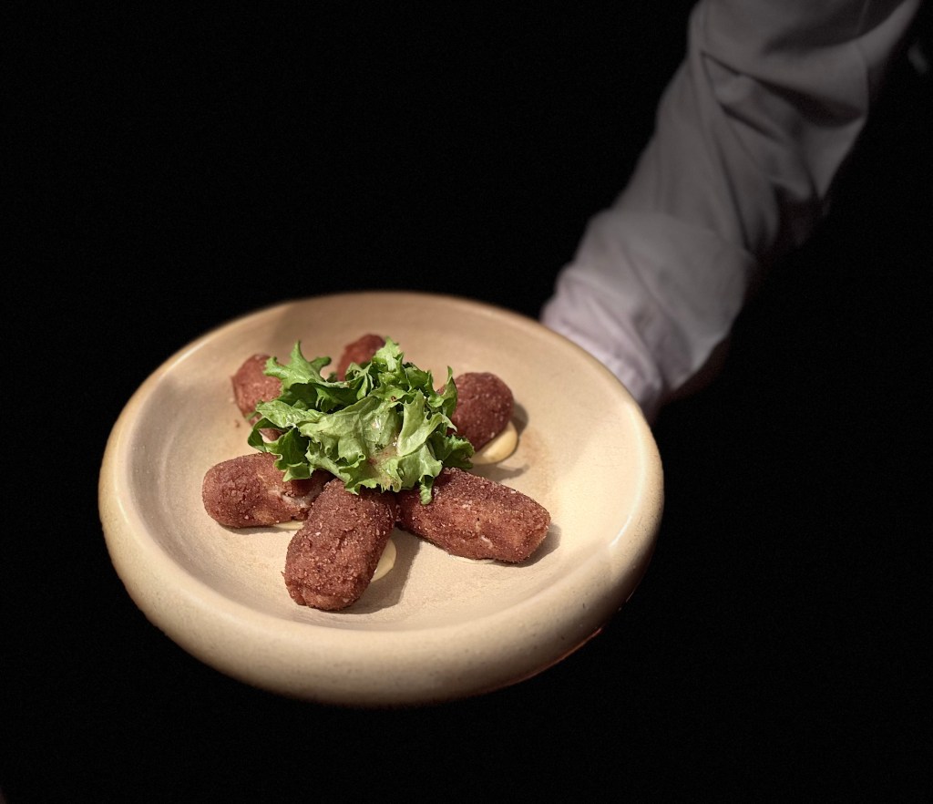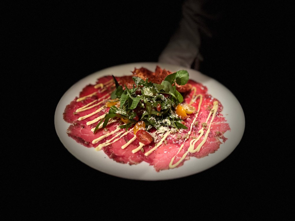 Las croquetas de ternera con jamón ibérico continúan en esa misma línea de equilibrio. Doradas por fuera, suaves por dentro, revelan una técnica precisa que no busca protagonismo, sino perfección. Luego, el carpaccio de solomillo introduce una pausa distinta: más ligero, más delicado, donde las láminas de reggiano, los chips de ajo y el toque de mostaza Dijon construyen un conjunto que se siente limpio, bien definido.
