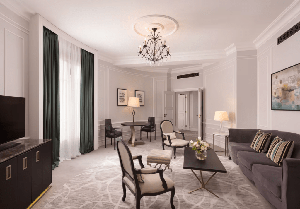 Hoy, esa herencia se siente intacta, aunque reinterpretada con una sensibilidad contemporánea. Sus interiores mantienen la esencia de la Belle Époque, con una elegancia infinitamente seductora. Mármol, obras de arte, lámparas de cristal y una paleta suave construyen un ambiente que invita a la calma.